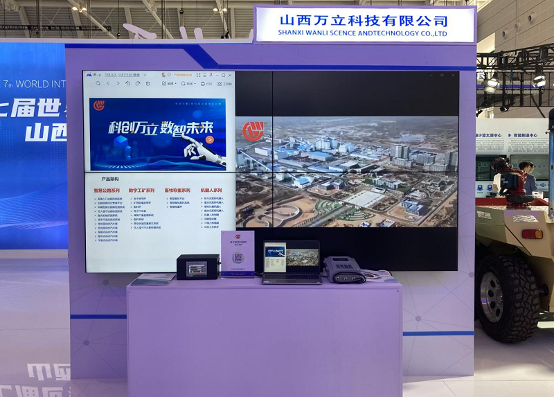 山西萬(wàn)立科技展臺(tái),通過(guò)電子屏滾動(dòng)播放的方式全方位展示了智慧公路、數(shù)字工礦、畜牧稱(chēng)重、機(jī)器人四個(gè)系列產(chǎn)品。